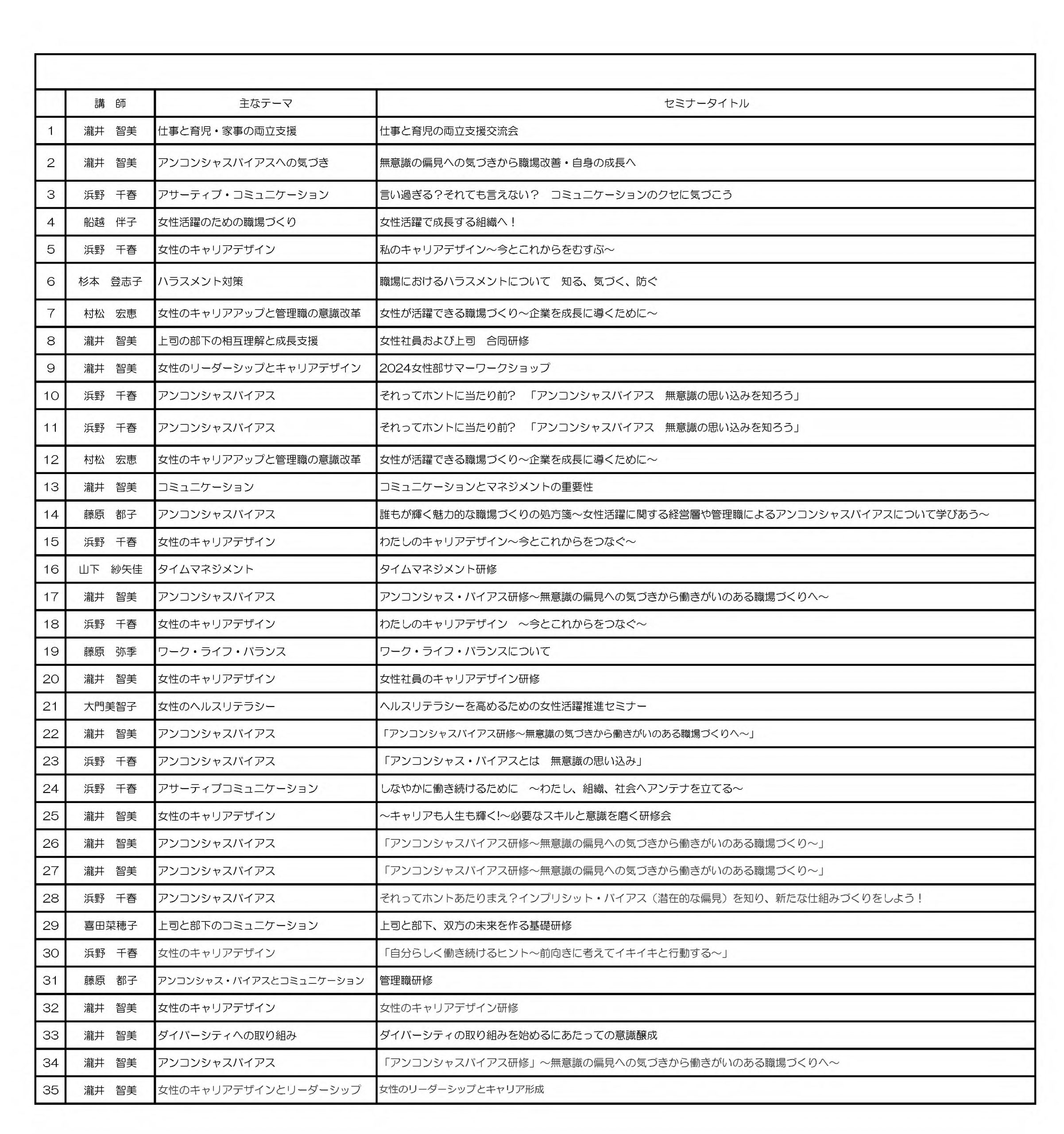 必要に応じ専門講師を無料で派遣します。 女性の能力発揮、人材育成、職場の意識改革等に取り組む企業・団体に対し、各社の事情に即した研修の企画と実施を支援します。