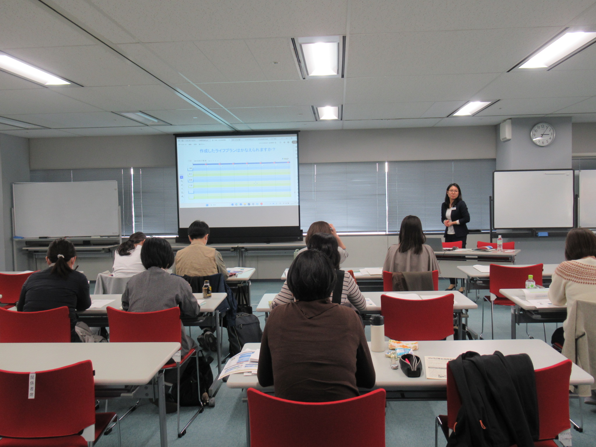 その後、「夫なき、妻なき後、一人で生きるために必要なお金」のことや「ライフプランニングシート」や「デザインブック」などに参加者が実際に自らの家族状況、将来のライフイベント等を書き込み、講師がそれぞれの机を回る形式でワークが行われました。