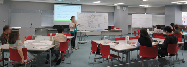 グループメンバーに自己紹介をし、円滑かつ決まる会議のコツ、グループ運営の留意点などを学びました。次に、自分も相手も尊重し、誠実に、率直に、対等に自分の要望や意見を相手に伝えるコミュニケーション(アサーション)について学び、事例をもとに実際に演習をしてみました。