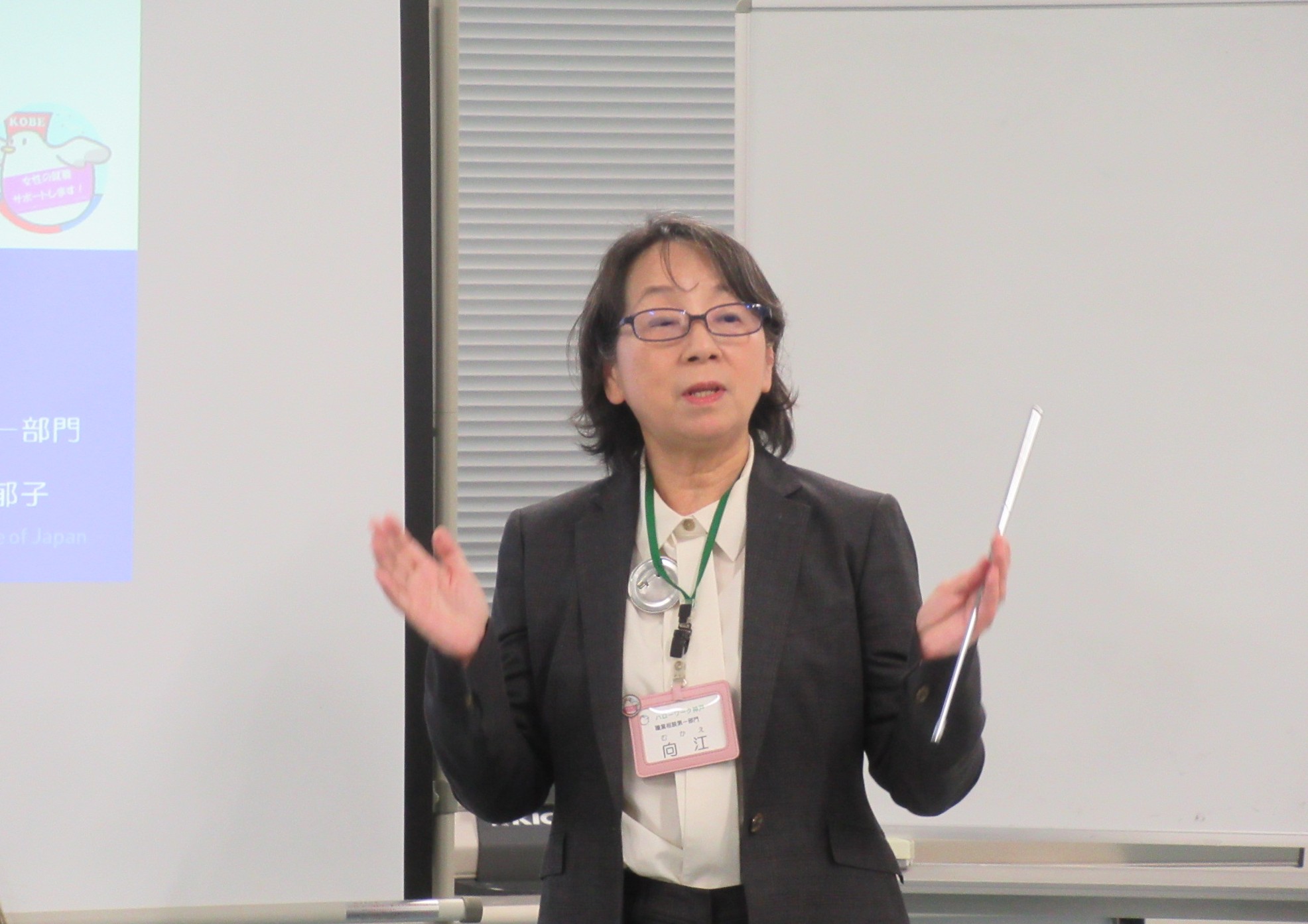「働きたい女性のためのハローワーク活用のコツ」をテーマに、ハローワーク神戸 女性就業相談室 就職支援ナビゲーターの向江郁子さんにご講義いただきました。